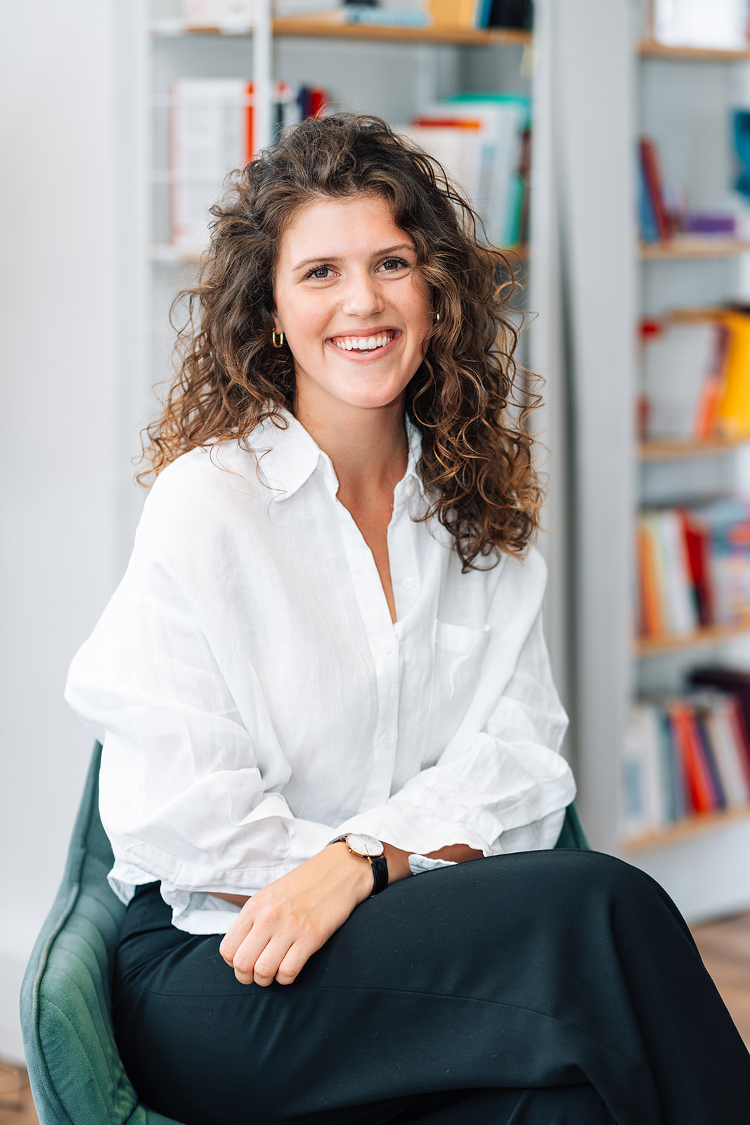 Eine lächelnde Person mit langen blonden Haaren und Brille steht vor einer hellen Ziegelwand. Sie trägt ein weißes Hemd und ein blaues Sakko. Die Arme sind entspannt an der Seite.